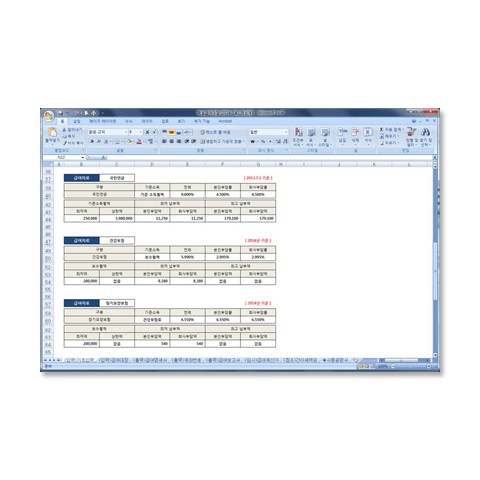 급여 자동계산 관련한 기초정보를 입력/수정하는 시트 화면입니다. 국민연금, 건강보험, 장기요양보험, 고용보험 등의 납부액 산출을 위한 기초자료를 입력/수정하며, 파일을 구매 하시면, 2014년 2월 말 기준, 최신 자료가 이미 입력되어 있습니다. 지급 급여를 입력하는 것만으로도 쉽게 급여작업을 끝낼 수 있습니다!